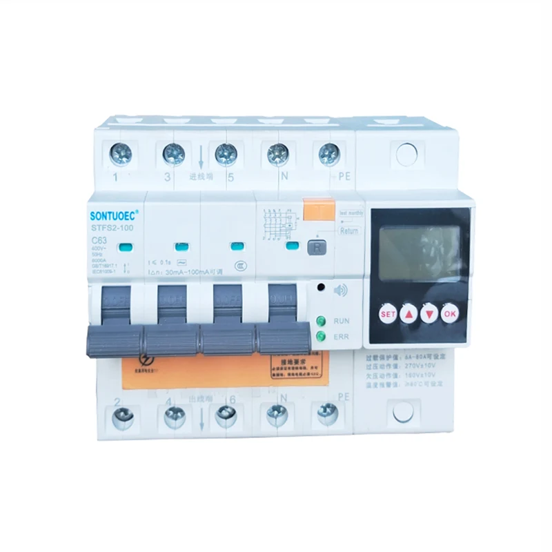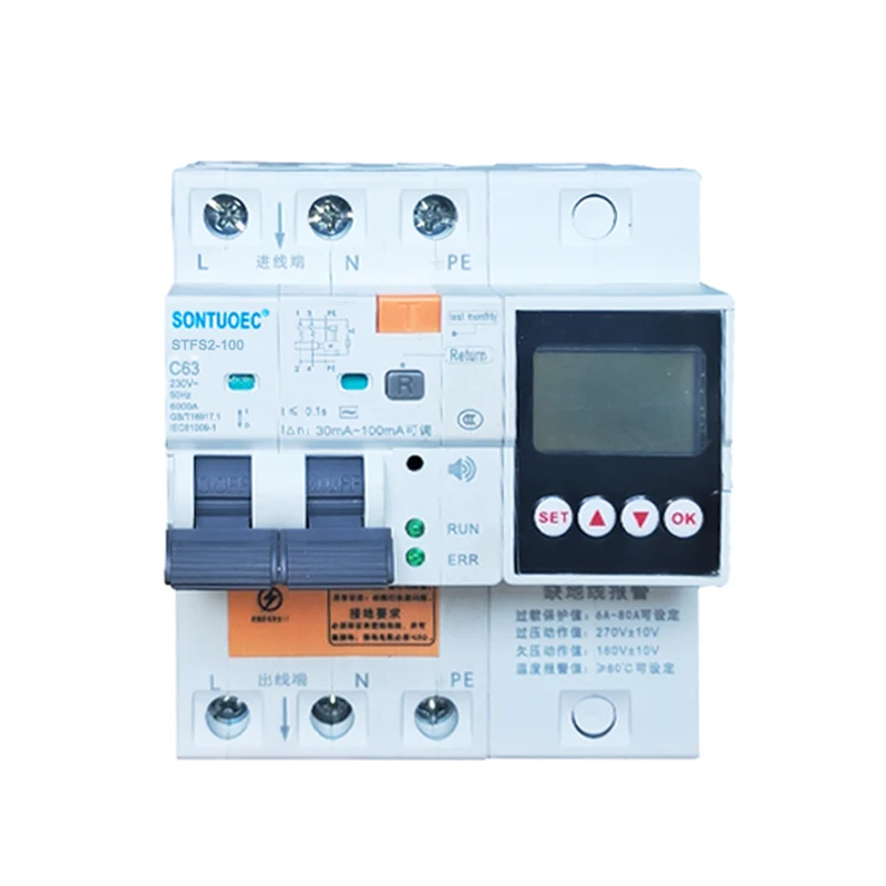 STSF2-100 100A 2P 4P Multifunkční RCBO je vhodný pro AC 50/60Hz, jmenován v obvodu s napětím 230 V-400V a jmenovitým proudem 100A, když je apersonkován elektrickým proudem nebo úniku výkonové mřížky. Když únik, přepětí a podpětí dosáhnou hodnot nastavených hodnot, může zbytkový proudový jistič rychle pracovat ve velmi krátkém časovém období rychle odříznout napájení. Když monitorovací teplota zbytkového proudového obvodu dosáhne nastavené hodnoty, monitorovací zemní vodič není připojen. Při připojení produktu vydává zvuk alarmu, který chrání bezpečnost personálu a elektrického vybavení a může se vyhnout Zabraňte poškození zařízení způsobeného přepětím v energetické mřížce. Má přetížení, zkrat, únik, přepětí podpětí a funkce ochrany předběžného vysílání lze také použít k občasnému zapnutí a vypnutí elektrických zařízení za normálních okolností Osvětlovací obvody, zejména vhodné pro průmyslové a komerční systémy distribuce osvětlení. Produkt má malý objem, kompaktní strukturu a lepší efektivitu nákladů než jiné podobné produkty. Má krásný vzhled, Vysoká lámací kapacita z něj dělá dobrou volbu pro distribuci energie v domácnosti. Tento produkt splňuje standardy GB/T 16917.1 a IEC 61009-1 a získal certifikaci CE.